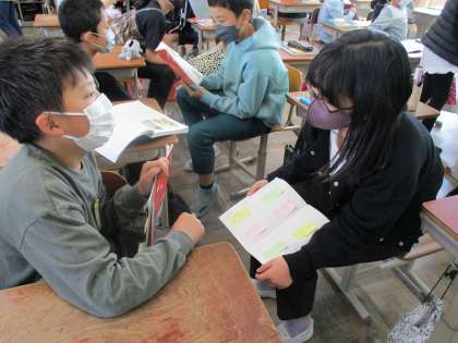 感想を伝える際には、今まで自分が作ってきたノートを指さしながら、自分の言葉で話していました。二人の関わりの変化とそのきっかけになった出来事について、自分と同じ意見をもつ友達が多かったようで、話が盛り上がる場面もありました。