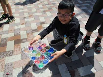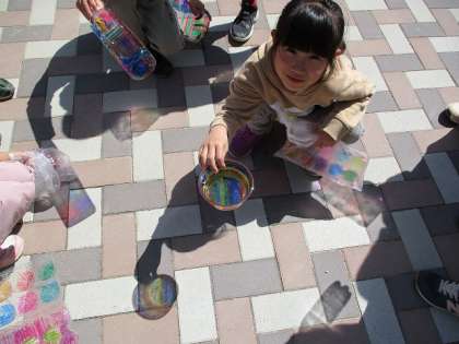 雨や曇り空でなかなか外で、つくった作品を太陽の光にあてることができませんでしたが、今日は晴天!作品が太陽の光にあたると子どもたちから「わぁ〜!」という歓声が上がっていました。