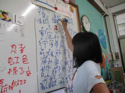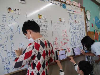 タブレットを使って、「に」や「か」など好きな頭文字から始まる漢字・言葉を調べて、ホワイトボードに記しました。初めて見る漢字や、たくさんの言葉に出会えたと思います。タブレットで検索するのも、とても上手になりました。