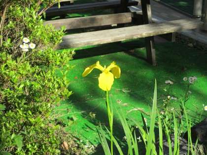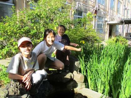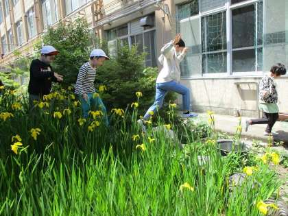 国語の教科書に「きせつの言葉」という見開きページがあり、春夏秋冬にまつわる言葉がいろいろと載せられています。春の五月皐月のページには、子ども日と並んで「しょうぶ」の花が描かれています。「この花を知ってる?」「知らな〜い。」「学校の中にもあるよ。」「どこに?」「探してごらん。」というやり取りのあと、何人かが見つけました。連休前に数本咲かせたのです。「黄色やん。」「キショウブって言うんやで。」