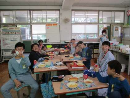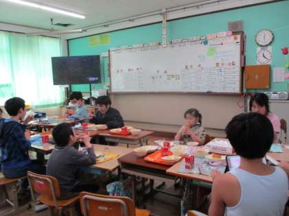 コロナウイルスによる規制が緩和されたことで、向かい合って給食を食べることができるようになりました。みんなでワイワイ、楽しく食事をすることができて嬉しく思います。