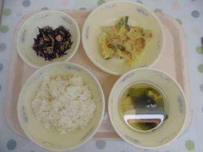 若竹汁は、春が旬のであいもん「わかめ」と「たけのこ」を使用したすまし汁です。かつおぶしと昆布でだしをとり、味わい豊かに仕上げました。見た目で「どうかな…?」と思っていた子どもたちも、食べてみると「おいしい!」とおかわりをたくさんしていました。
