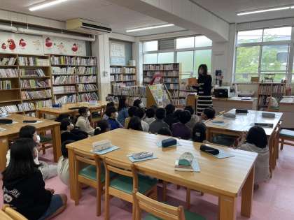6年生になって初めての図書館での学習。今年度着任された司書の西村先生のお話を聞きながら、改めて学校図書館の使い方や活用方法について学びました。先生の自己紹介やお話が面白く、笑顔がこばれる1時間となりました。読み聞かせもしてくださり、反応を示しながら聞く姿がありました。今年度から2冊貸出になったので、積極的に学校図書館を利用してみてください。