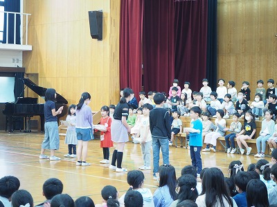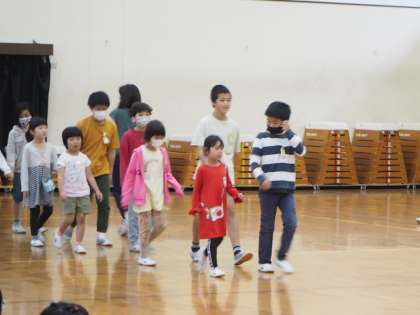1年生は6年生に手を引かれて入場しました。たくさんの上級生を目の前にすると、緊張している様子もありましたが、ドレミの歌や○×クイズをしてもらい、とても楽しそうに過ごしていました。連日練習していた、お返しの歌「さんぽ」も大きな声でかわいく踊り、披露する姿が素敵でした。