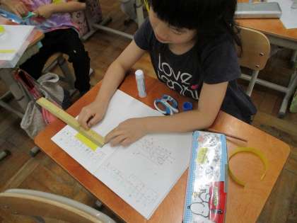 算数科「長さ」の学習では、10cmの長さを予想して紙テープを切りました。
