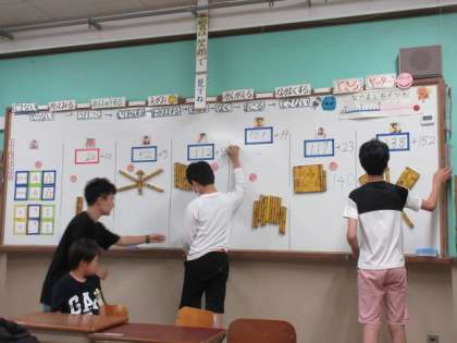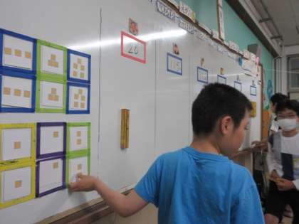 6年生は、ホワイトボードにそれぞれが指定された数の積み木を貼ります。具体物を使い、数を5や10、50、100といった塊として捉えることで、桁の大きな数でも理解が深まると感じます。