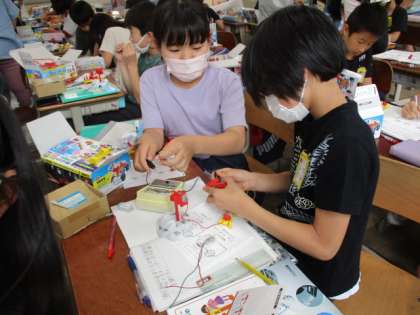 電流も大事なのですが、ここで一番理解しておいてほしいのが、回路。電気の流れる道をつくることです。実際の配線を簡単にしたのが回路図ですが、この回路図と配線が結びつけることが難しいようです。導線の長さが違うからでしょうか。回路図と配線を理解した上で、電池の直列つなぎ、並列つなぎの違いを確認するように学習を進めています。今は学習キットを学校に置いていますが、持ち帰ったらいろいろと触って学習を深めてほしいと思います。