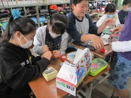 「電池のはたらき」で学習する単位として「アンペア(A)」があります。アンペアとは、電気の流れる量、つまり電流を表す単位です。家庭では20Aや30Aで契約されていると思うのですが、子どもたちが使うのは電池。流れる量も0.2A程度です。しかし数値があることで、プロペラの回転数が上がる仕組みが理解できます。簡易検流計の目盛りを読んで、「さっきと違う。上がっている。」という声が聞こえていました。
