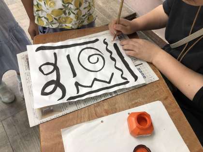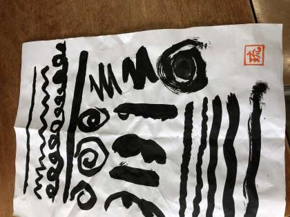 はじめの学習で書いた自分の作品に、木下先生が名前の一文字を入れてもらいました。できた作品は参観で掲示します。ぜひご覧ください。