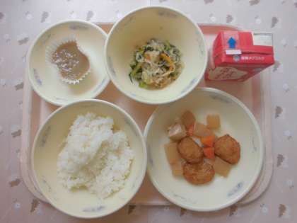 給食では、米粉・黒ざとう・さとうを混ぜて1つずつカップに入れ、スチームコンベクションオーブンで蒸して作りました。優しい甘さやもっちりとした食感が味わえました。