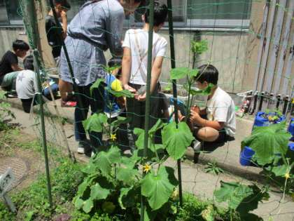 星の子学級のキュウリはひげも出てきてどんどん伸びています。同じウリ科の作物ですので、参考になるかもしれません。収穫期間がツルレイシの方が長めですので、夏休みにかけて伸びるだろうと思います。どのような実のつき方になるのか、見守っていきたいと思います。