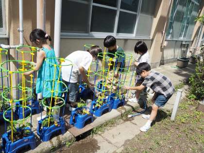 今週,あさがおのつるが伸びてきたので,話し合いをしました。「このままではつるが下に伸びてしまって元気がなくなる」「上に伸びるようにしたらよい」といった意見をもとにみんなで支柱を立てました。これで元気よく育ってくれそうです。