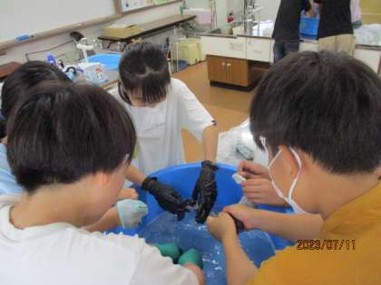 手洗いをしたことがないという人も多く、「これでいいんやんな?」と確かめながらの実習でした。半日も履いていない靴下だったので、そんなに汚れていないと思いきや・・・