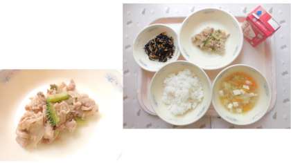 夏においしいゴーヤを取り入れた給食です。苦みが苦手な子どもたちのために、わたをしっかりと取り、一度さっとゆでてから炒めました。