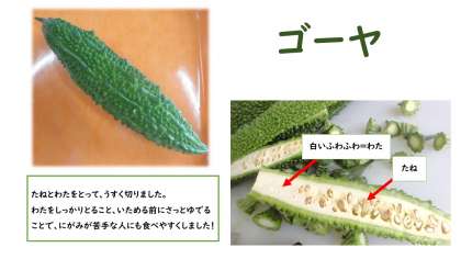 食べる前は「ゴーヤは苦手…。」と言っていた子たちも、「ぶた肉と食べたらおいしい!」「思っていたより苦くないね。」と言いながら食べていました。