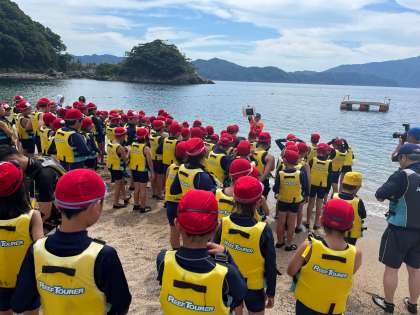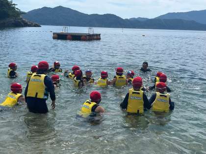 若狭湾で水泳です。泳力別に3チームに分かれて、波打ち際から沖の浮島へ。おもいおもいに楽しんでいます。