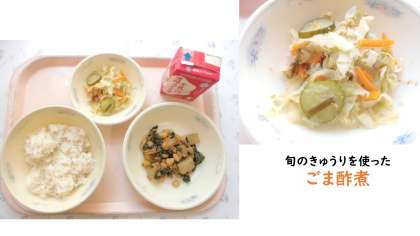先週は「冬瓜」を「くずひき」に。今日は「きゅうり」を「ごま酢煮」に取り入れました。