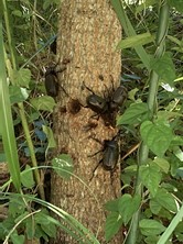 同時期に、炭焼き用に栽培されているクヌギの木に群がっているカブトムシを発見しました。カブトムシだけでなく、クワガタやチョウ、スズメバチも登場する、樹液の取り合いが壮絶な現場でした。調べると、カブトムシの野生での寿命は、成虫になってから平均1〜2週間だとか。あの見た目の大きさから、すぐに捕食されてしまうらしいです。そういえば数年前、頭だけのカブトムシを多数見かけたことがあります。聞くところによると、カラスに食べられているらしいとのこと。大空を飛ぶカブトムシも大変なのですね。