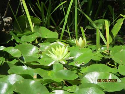 お盆前に「なかよし池」を覆っていたキショウブの葉をばっさり刈り取りました。そうすることで目立ったのがスイレンの葉。こんなに茂っていたのかという感じだったのですが、しばらくするといくつかの花も目にするようになりました。スイレンの葉にカエルが乗っているイラストなどから、スイレンの花の咲く時期は梅雨ごろと思っていたのですが、調べてみると5月から10月まで咲くらしいです。花は水面からちょこっと顔を出す感じで、葉に撥水性はなく切れ込みがあり水を流します。