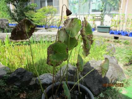 対して、花が水面から大きく伸びて咲き誇り、葉に撥水性のあるのがハス。「蓮」という漢字から「睡蓮」と混同しがちですが、一目瞭然です。いただいたハスは夏前の花期が過ぎ、実は枯れています。しかし、このハス、根は蓮根としてもちろんのこと、葉も茎も実も食べられるそうです。そのためにはもう少し大きなところで栽培した方がよさそうですね。