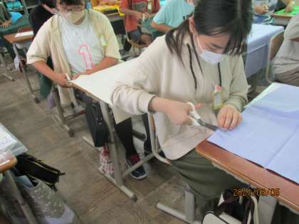 5年生では初めてミシンを使ってランチョンマットを作りました。「ちょっと苦手・・・」という人が多いようですが、「袋が出来上がったら、こんなことに使いたい!」と目的をもつと、頑張る気持ちが湧いてきたようです。まずは断ち切り線で布をたつ作業です。緊張しつつ、一歩前進!