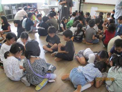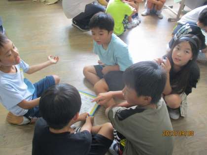 今日は学年のお楽しみ会をしました。クラスを混ぜたグループにして、協力しながらミッションを達成していきました。グループで校歌を歌ったり、給食に出てくるさんまの産地を考えたりしました。