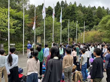 山の家に到着しました。小雨が降り始めました。お天気の様子を見ながらこれからのプログラムを進めます。みんな元気です。