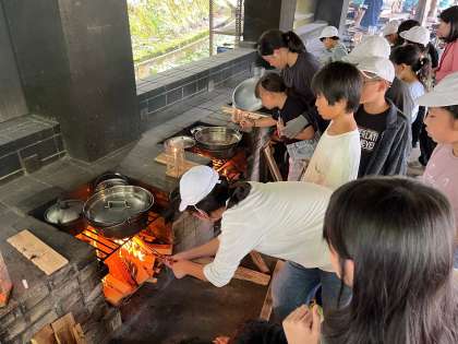 野外炊事です。ご飯を炊いて、カレーを作りました。野菜の大きさや水加減に気を付けながら協力してつくりました。なかなか火が付かない班もありましたが、悪戦苦闘の末、全ての班で美味しいカレーが出来上がりました。