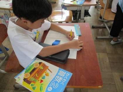 2年生では算数科の「図をつかって考えよう(2)」をしました。ふりかえりを読んでいると、「図を使うことで、計算しやすいことが分かった。」や「まとめて計算する方法が分かった。」など様々な意見がありました。