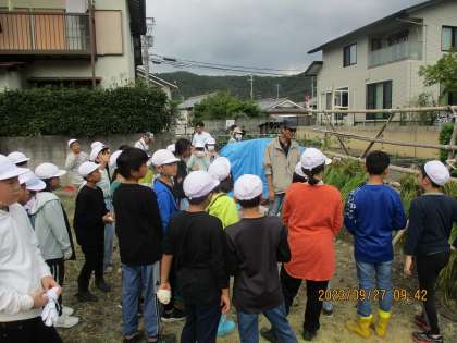 前回は機械で刈り取る様子を見学していましたが,今回は自分の手で稲刈りを行いました。畑の先生方は簡単に刈り取られますが,いざやってみるとなかなかうまく刈り取ることができない様子がありましたが,少しずつコツをつかみ頑張って刈り取ることができました。