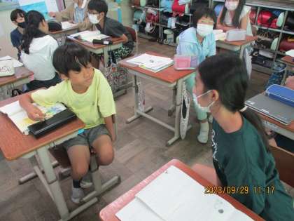 国語科は物語の「たずねびと」を学習しています。それぞれの場面を表に整理しながら。主人公の心情の変化について考えました。それぞれの意見を交流すると様々な考えが広がり,班での交流も面白いです。