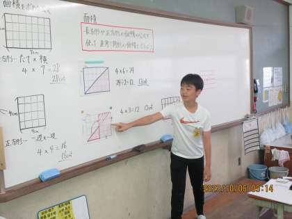 算数は面積の学習に入りました。これまでは長方形・正方形の面積の求め方を学習しました。今回は直角三角形の面積の求め方に挑戦しました。難しそうに見えるけれど,「これまでの学習した公式を使うと意外と簡単」という声が多かったです。次は何の学習をしているのかな?