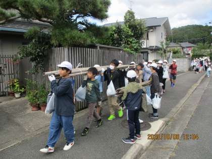 脱穀体験のをした後は片付けも行いました。稲を干していた稲木の解体を学び,長い竹を学校に持ち帰りました。片づけを通して,米作りの大変さを改めて感じることができました。