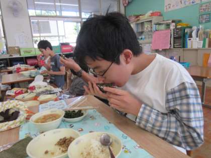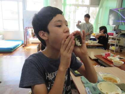 今日の給食は,一年に一回の納豆巻きの日でした。海苔にご飯と肉味噌納豆を乗せて,上手に巻くことができました。中には大きな納豆巻きを作りすぎて,具が溢れてしまうこともありました...(笑)