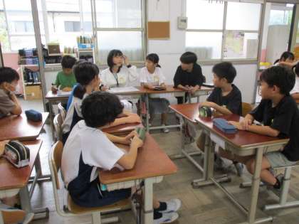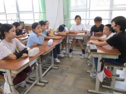 「会議」の練習です。司会、記録、時計係が進行し、提案者が自分の考えを主張し、それを参加者と討論する。この仕組みを学習しました。各クラスで議題も異なりましたが、興味深いことは共通していました。