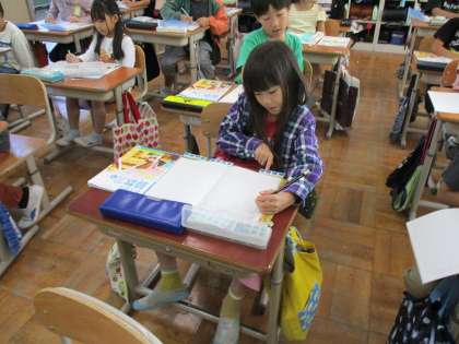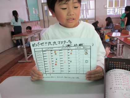 算数科「かけ算(1)」の学習では、数図ブロックを使って4の段の九九を作りました。4の段は少し言いづらそうにしている人もいましたが、一生懸命唱えて練習していました。九九マスターテストも順調に合格していっている人がたくさんいます。おうちでも学校でもたくさんとなえて九九マスターになろう!