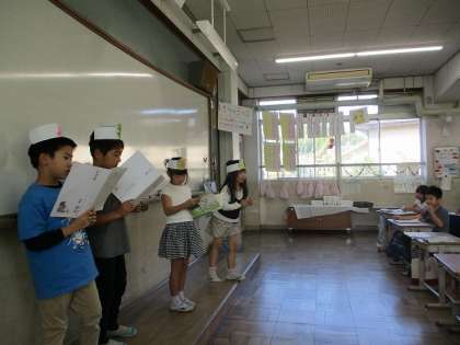 2年生の国語科ではアーノルド=ローベル作「かえるくんとがまくん」シリーズの音読劇に挑戦しています。各班の音読劇の後に「○○さんのセリフに、がまくんが驚いた時の気持ちが込められていて良かった。」や「○○さんが本には書かれていないセリフを考え、付け加えていたのが良かった」など、ミニ学習発表会のようです。
