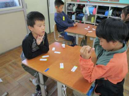 算数科「かけ算(1)」の学習では、九九カードを使ってかけ算ゲームをしました。式を見て答えを言ったり、答えを見て式を言ったりしました。すらすら言えるように、いろんな方法で九九を学習しています。おうちでもぜひしてみてください。