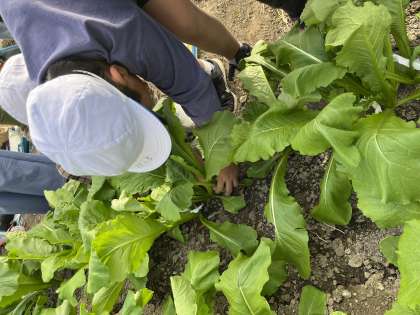 今日の午後は社会科「農家でつくられるもの」の学習で、地域のすぐき農家へ間引き体験をさせていただきました。たねまきの仕方から出荷までどのようなお仕事をされているか聞かせてもらいました。子供たちからのインタビューも丁寧に答えていただき、大満足でした。