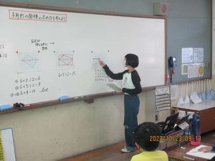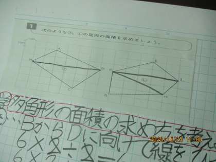 今日は多角形の面積の求め方を考えました。長方形でも台形ではない図形を求めるのに難しそうでしたが,対角線をひいて三角形にわけることで三角形の公式を使って面積を求めることができました。どのように分けるかが大事にしたいですね。