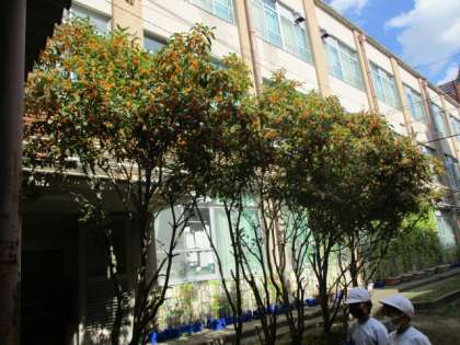 秋らしい花といえば、金木犀。北校舎の西入口の前で、甘い香りを漂わせています。中国原産で、江戸時代に日本に持ち込まれました。雌雄異株ですが、いま日本で咲いている金木犀は、すべて雄株だそうです。花がたくさんつくかららしいのですが、雌株はどのようなものか気にかかります。