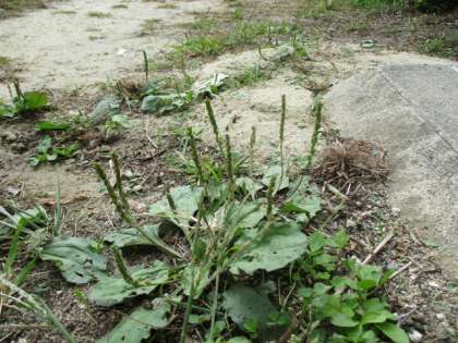 全く目立たない花ですが、オオバコの花が咲いていました。オオバコとは中国名で車前草。車や人が往来する通路上に生えているたくましい草です。その花茎で「オオバコ相撲」と言って引っ張り合ったものです。どこにでも生えている草ですが、本校では玄関わきのオシロイバナが咲いている前に大きめのオオバコがありました。この花が結実すると、種に粘り気があるらしく、靴や車輪にくっついて、次なる生育地に着地するようです。確かにここは、子どもたちがとても行き来する場所。本当にたくましい植物です。一度種をしっかりと見つめてみたいものです。