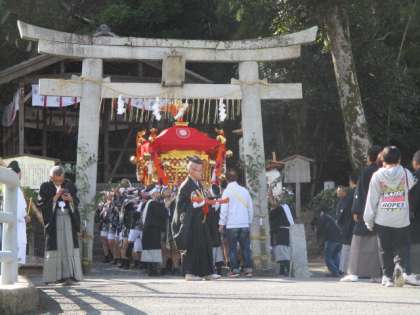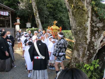 「還幸」に際し、子供神輿も含まれる行列を間近で見せていただきました。近年奉賛会に入られた方もおられるらしく、剣鉾を先頭に、稚児行列、子供神輿、大人神輿と賑やかな行列でした。子ども達も元気に掛け声を挙げて担ぎ上げていました。それでも神輿は、大人神輿と子供神輿の2基。昔は、さらに1基が出て、計3基が練り歩いたとのこと。このようなことは、日本全国どこの祭礼でも同様のことでしょう。時代に即した祭礼を維持し、継承していく大切さを考えさせられました。