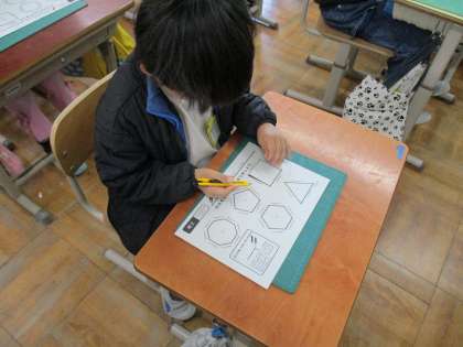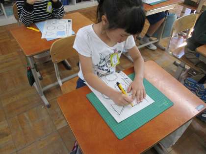 図画工作科「まどからこんにちは」の学習では、初めてカッターナイフを使いました。刃物を使うため、安全に十分に配慮して行いました。直線をカッターで切ってみたり、四角に切り抜いたりしてました。緊張感をもって最後までやりきることができました。子どもたちは「ドキドキしたけど楽しかった」と振り返っていました。