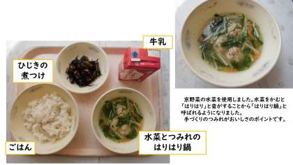 はりはり鍋の「はりはり」とは、水菜のシャキシャキした食感からついたと言われています。水菜は京野菜のひとつです。まぐろの水煮・鶏ひき肉・細ねぎ・しょうがと調味料を混ぜ合わせ、給食室で一つ一つ、つみれだんごを作りました。かむと口の中でふわっとくずれる手作りのつみれだんごのやわらかな食感と、水菜のシャキシャキとした歯ごたえが味わえる献立です。