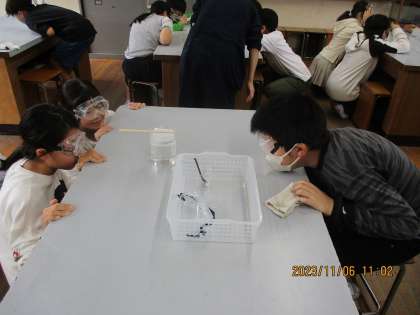 理科は「もののとけ方」という単元に入っています。コーヒーに砂糖を入れたり,抹茶ラテの粉末をお湯で溶かしたりと普段の生活の中でもものを溶かしています。今日を水に溶かして気付いたことについて話し合いました。どの班も一生懸命,観察していました。