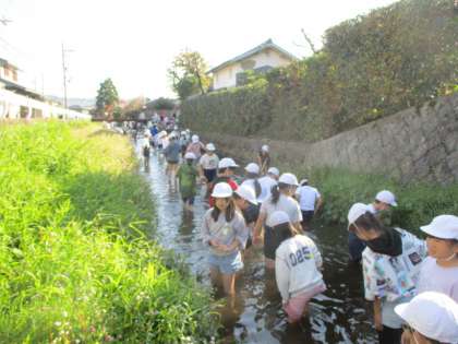 生物班は、魚やカニがいそうなところの目星がつけられていますので、足早にポイントに移動。次々と魚を中心にすくい上げていきます。前回は小さかった魚も少し大きくなっていました。中には10cm越えのアブラハヤもいました。大部分は放流し、観察用に元気そうな魚やヤゴ、アカハライモリなど数匹を持ち帰り、4年生教室近くの水槽で観察しています。