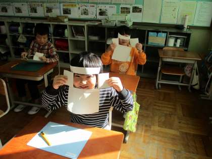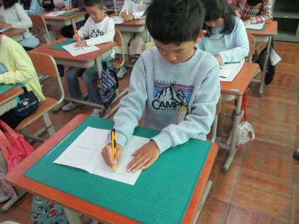 図画工作科「まどからこんにちは」の学習では、まどの仕組みを使って実際にまどを作ってみました。まどの形にするために、切るところと切らないところを区別して、出来上がりを想像しながら下書きをしました。実際に出来上がった窓をうれしそうに見ている姿もありました。カッターナイフの使い方にも慣れて、緊張感を持ちつつも、使いこなせるようになっています。