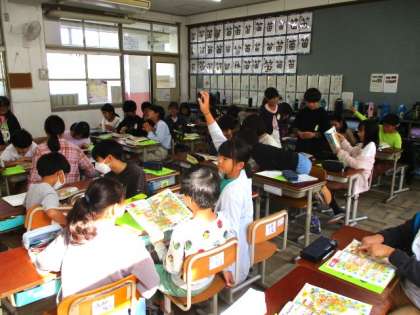 子どもたちが前に出て進行を務めながら、クラス中で大いに盛り上がるゲームをしています。廊下中に子ども声がこだまし、その活気が伝わってきます。