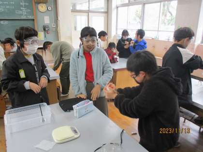 水に食塩を溶かす前と溶かした後の全体の量が変わるか変わらないかを調べました。どの班も食塩が入った瓶を懸命に降って食塩を溶かしていました。実験をしてまとめる。大変だけど最後までやりきりました。